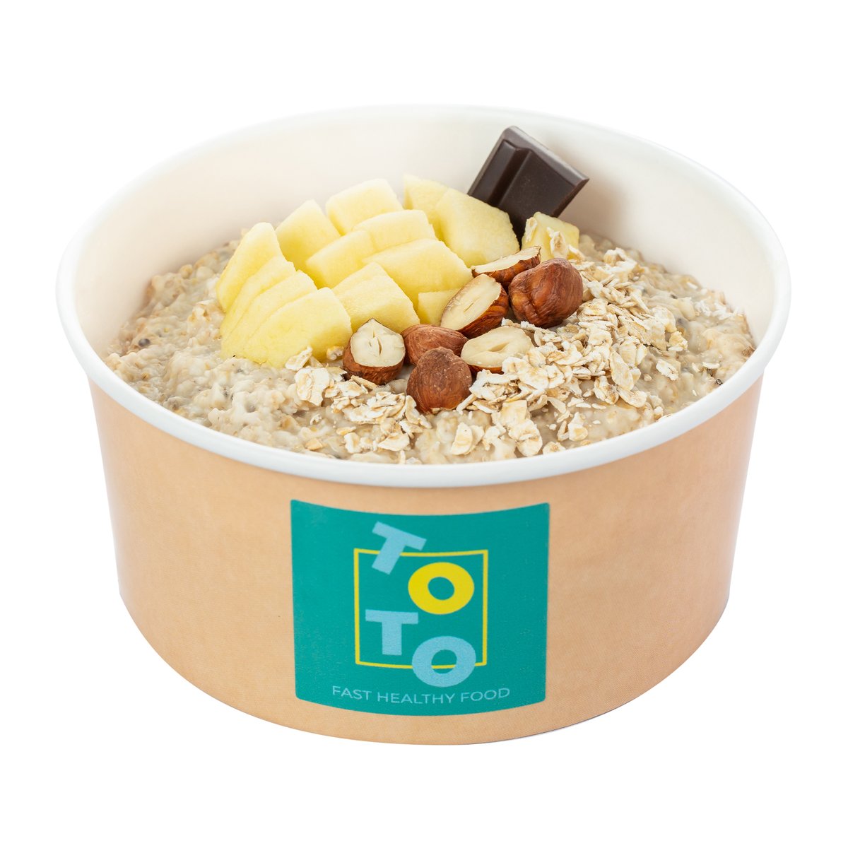 442kCal; Sastojci:Ovsene pahuljice,bademovo mleko,jabuka,cimet,crna čokolada,lešnik sirovi