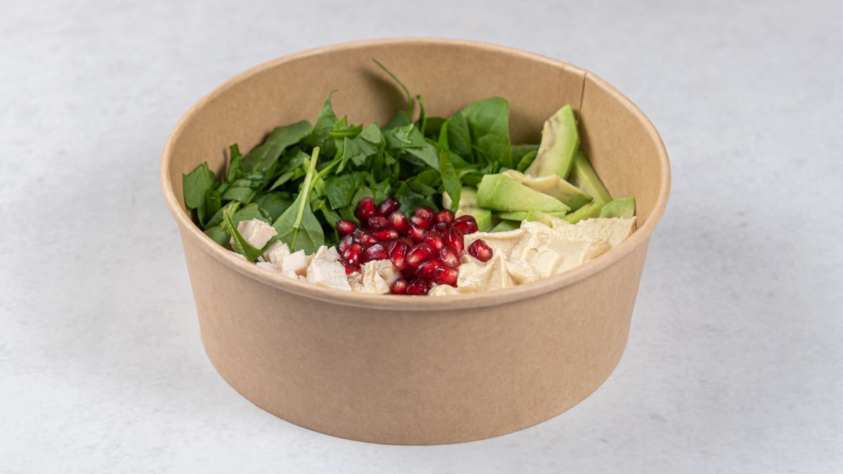 grilovani pileći file, humus, avokado, baby spanać, nar, maslinovo ulje