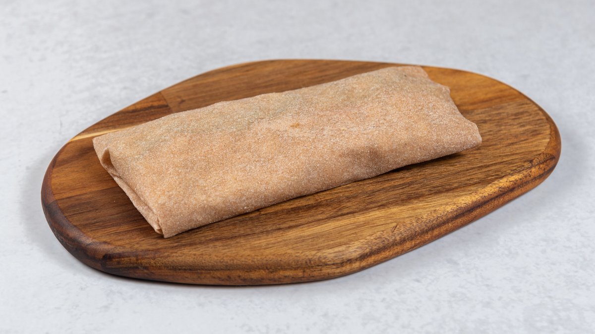 ručno rađena ZrnoRa tortilja od speltinog i brašna crvenog kukuruza, maslac, grilovani pileći file, cherry paradajz, kačkavalj, svež krastavac