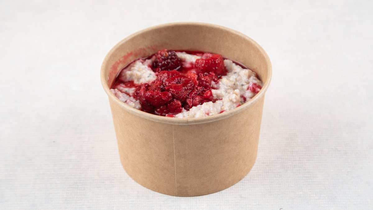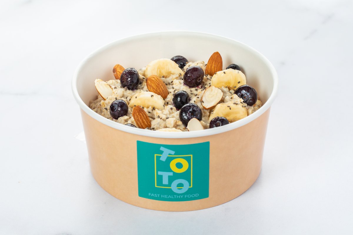 355kCal; Sastojci :Ovsene pahuljice,čia semenke,banana,borovnica,badem sirovi,voda