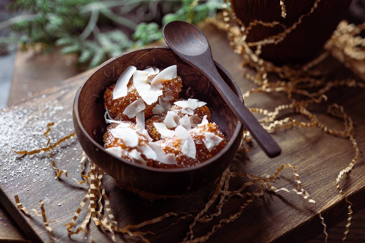Banane, kokosova strugotina, mleko, pohovanje, karamel preliv 200g (Bananas, coconut flakes, milk, breading, caramel topping)