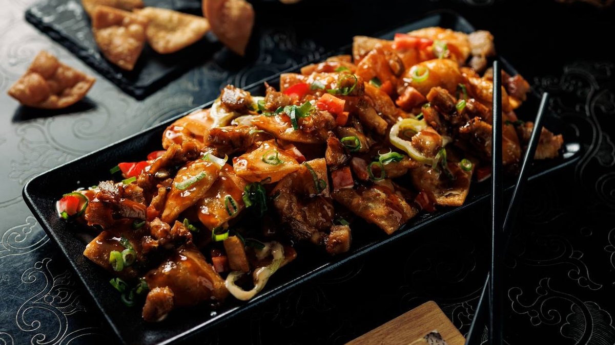 Piletina, testo, sos od srirache i terijakija, paprika, zeleni luk, susam 250g (Сhicken, fried dough pieces, sriracha–teriyaki sauce, bell peppers, green onions, sesame)
