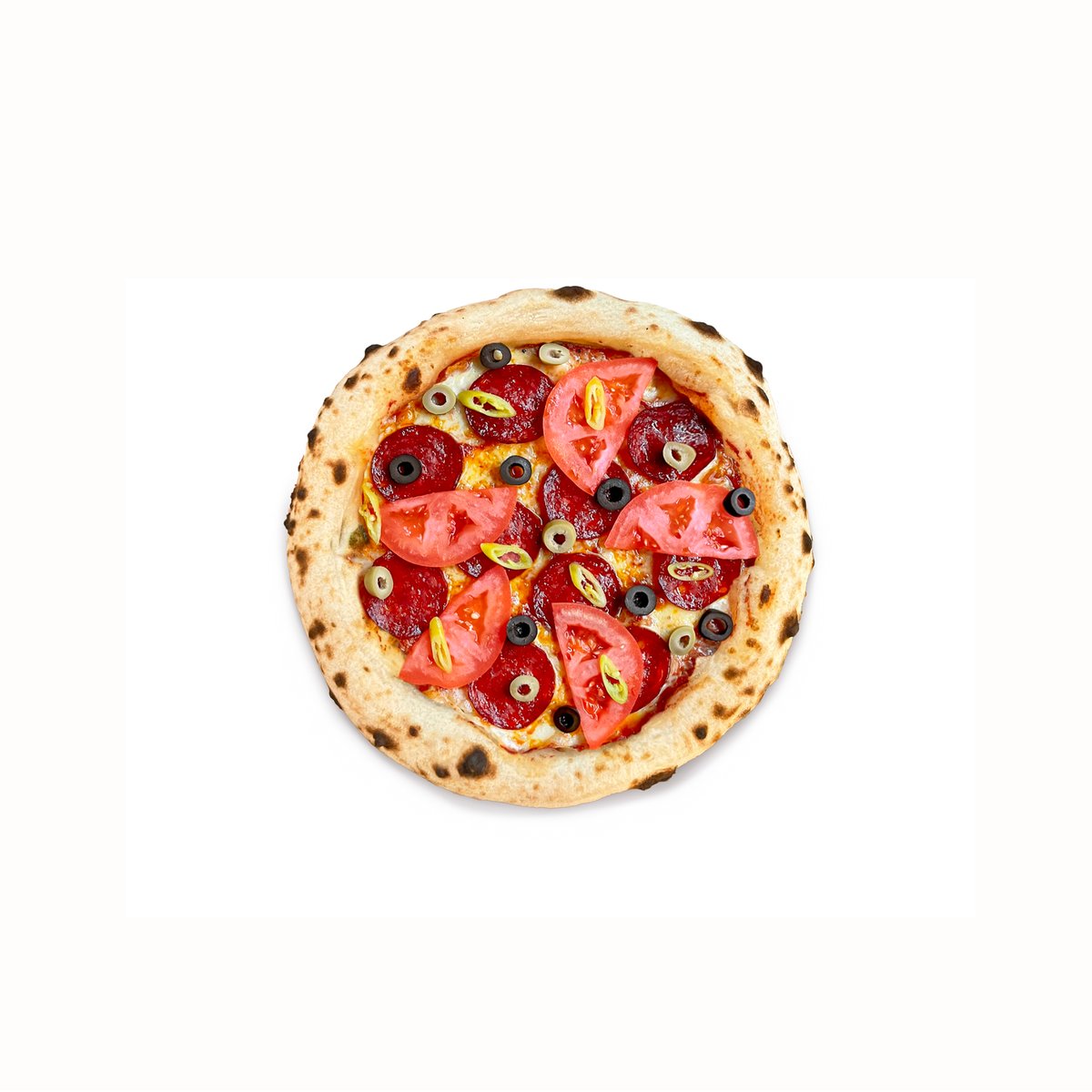 pizza sos, mocarela, pepperoni, paradajz, masline, ljuta marinirana paprika