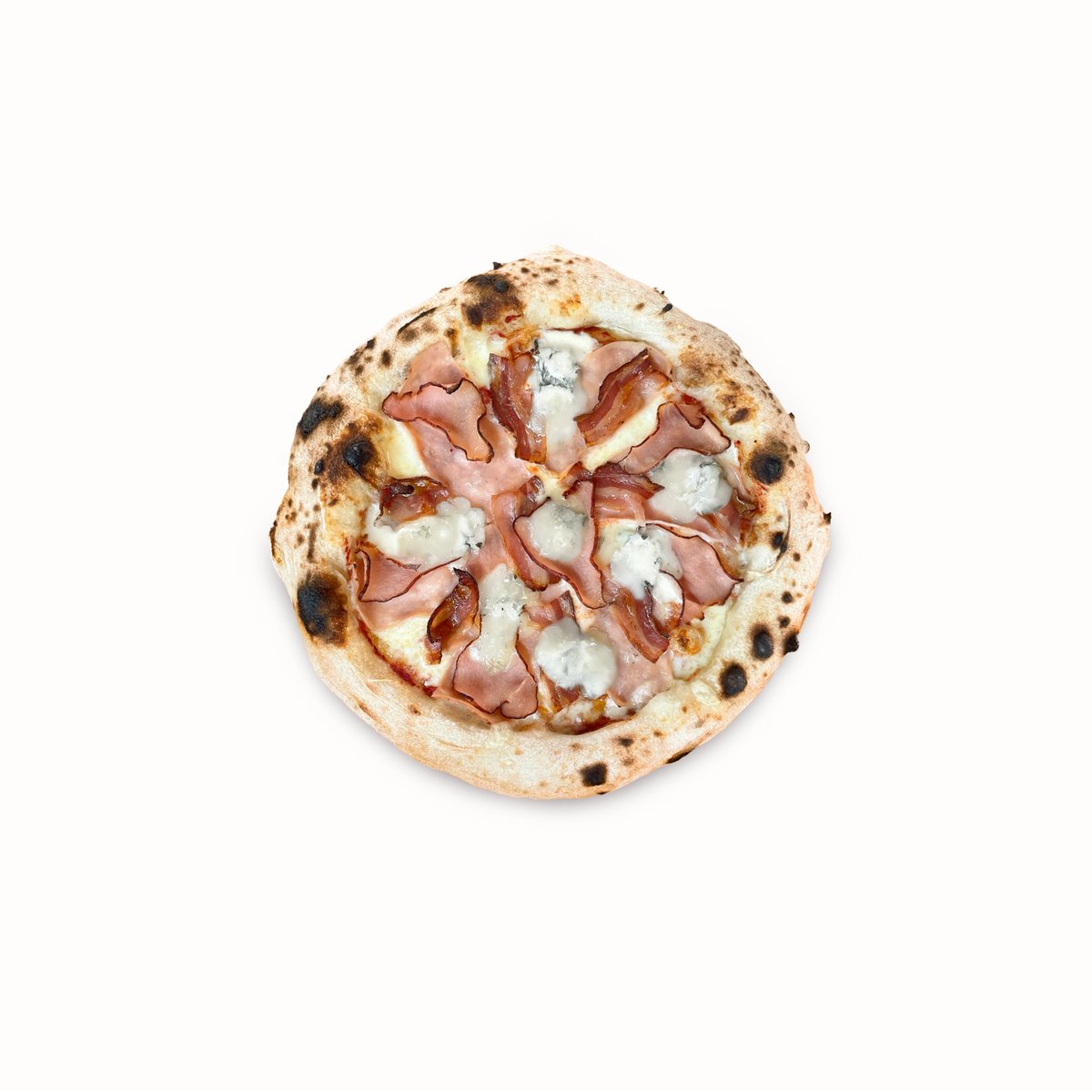 sos beli/ pizza po izboru, mocarela, šunka, slanina, gorgonzola