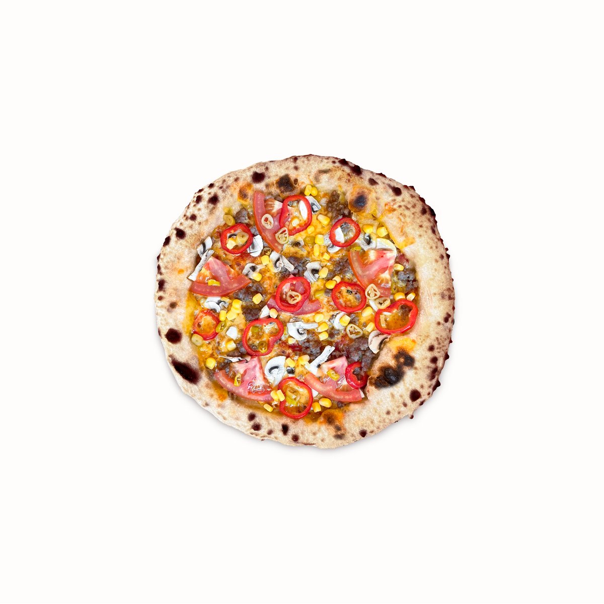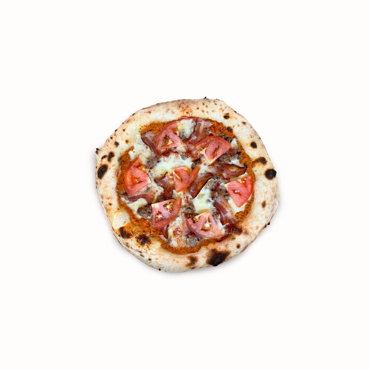 pizza sos, mocarela, mleveno meso, slanina, paradajz, ajvar