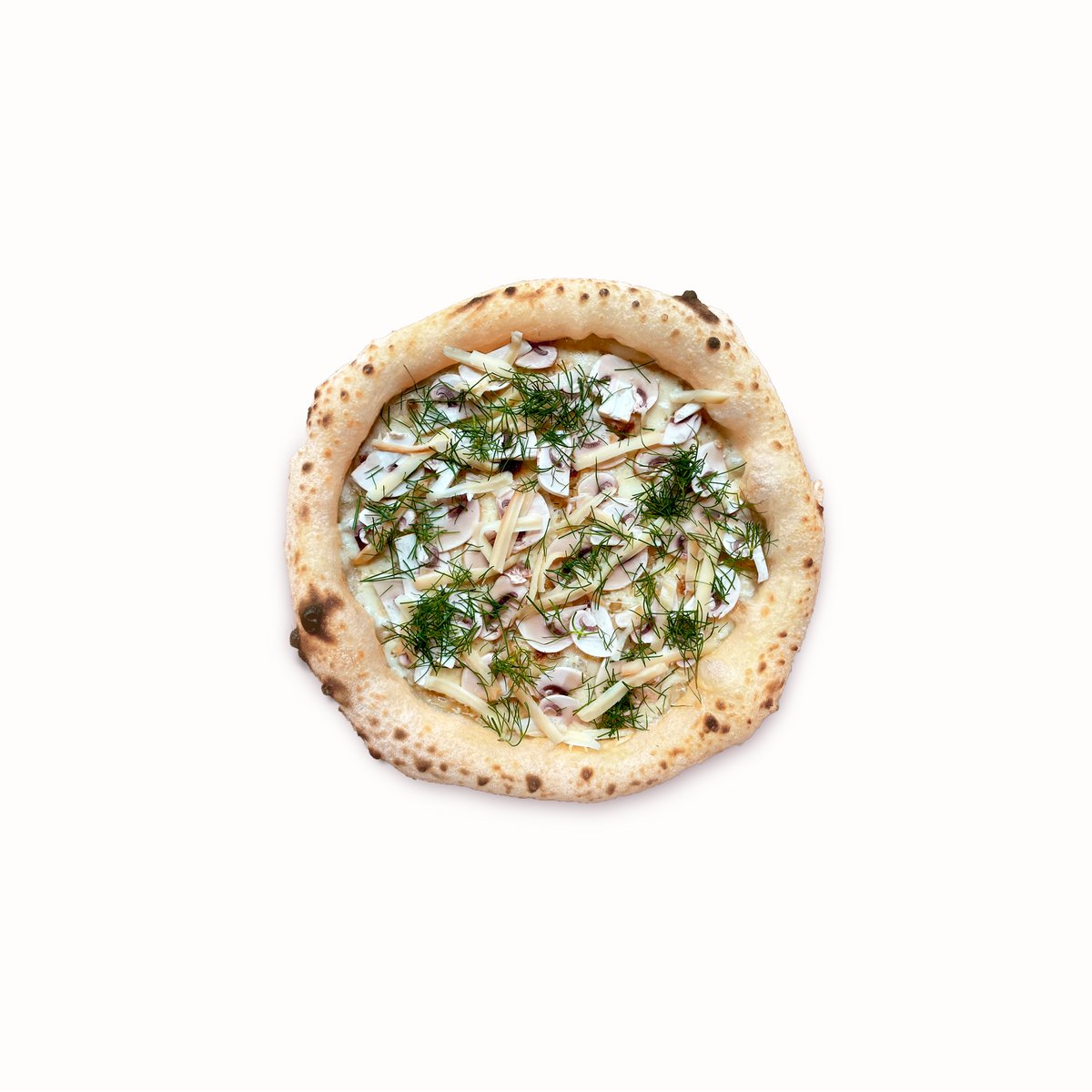 sos beli/ pizza po izboru, mocarela, šampinjoni, crveni luk, dimljeni sir, mirođija