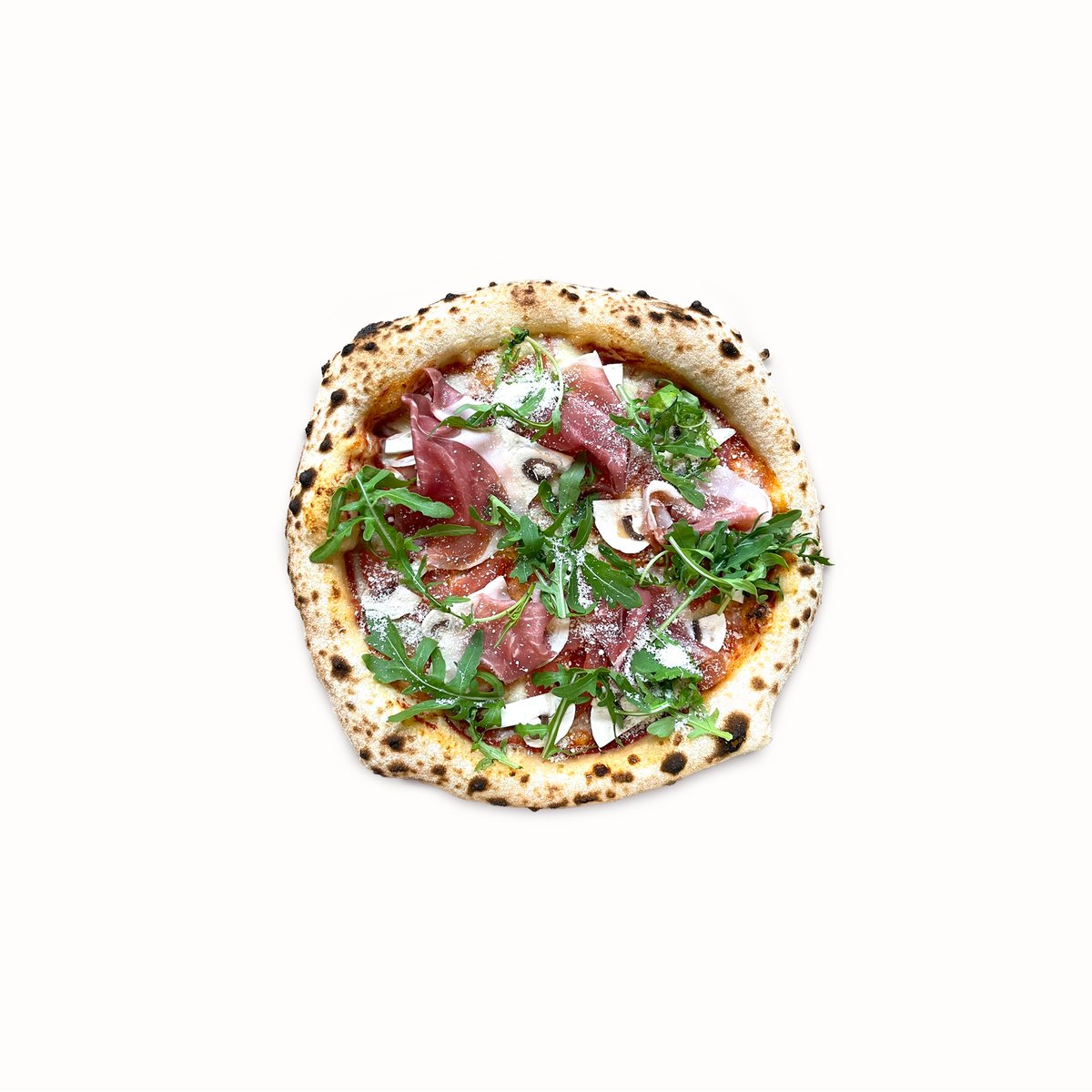 pizza sos, mocarela, pršuta, šampinjoni, paradajz, parmezan, rukola