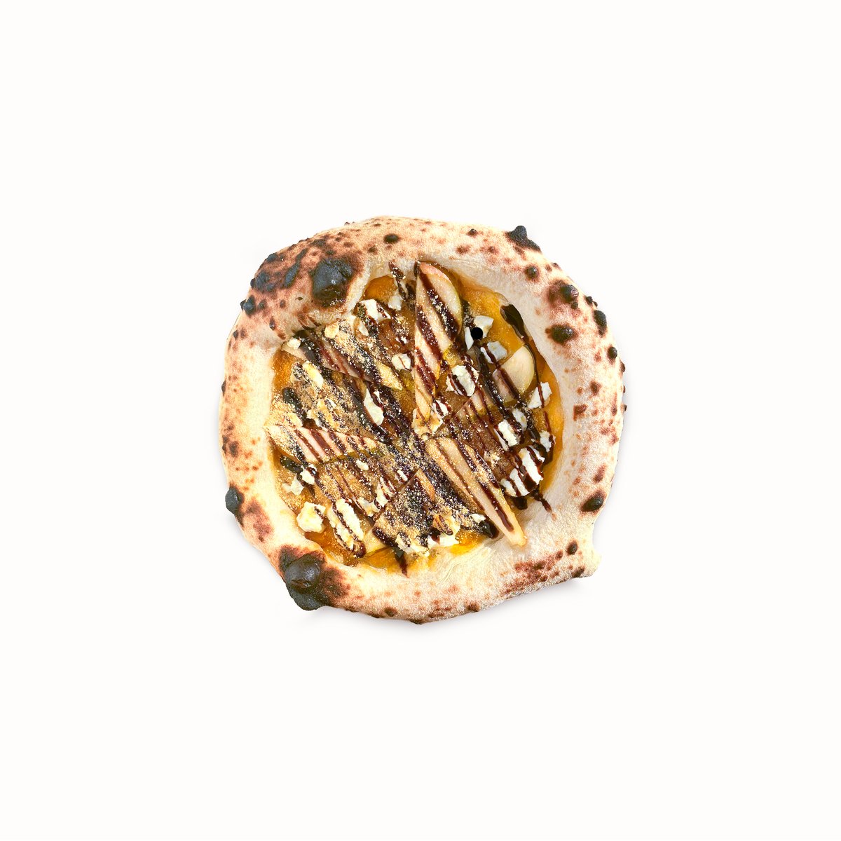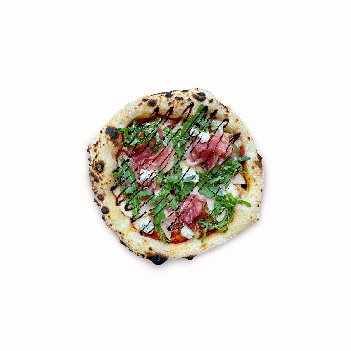 pizza sos, mocarela, pršuta, kruška, gorgonzola, balzamiko krem, rukola