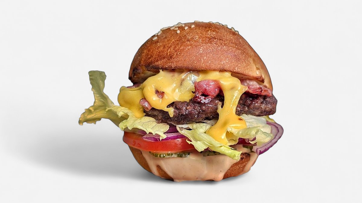 Domace zemicke, 100% govedina, slanina, crveni luk, paradajz, kiseli krastavac, ajsberg salata, cedar, majoBBQ
