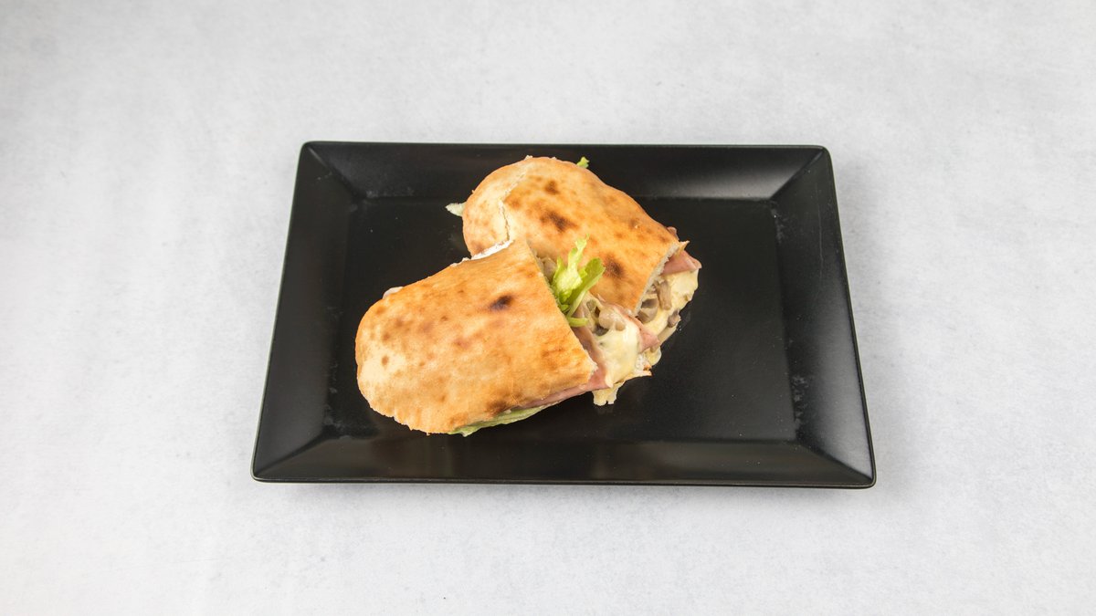 Sveže ispečen somun, grilovana praška šunka, gauda sir, marinirani šampinjoni, prilozi po izboru