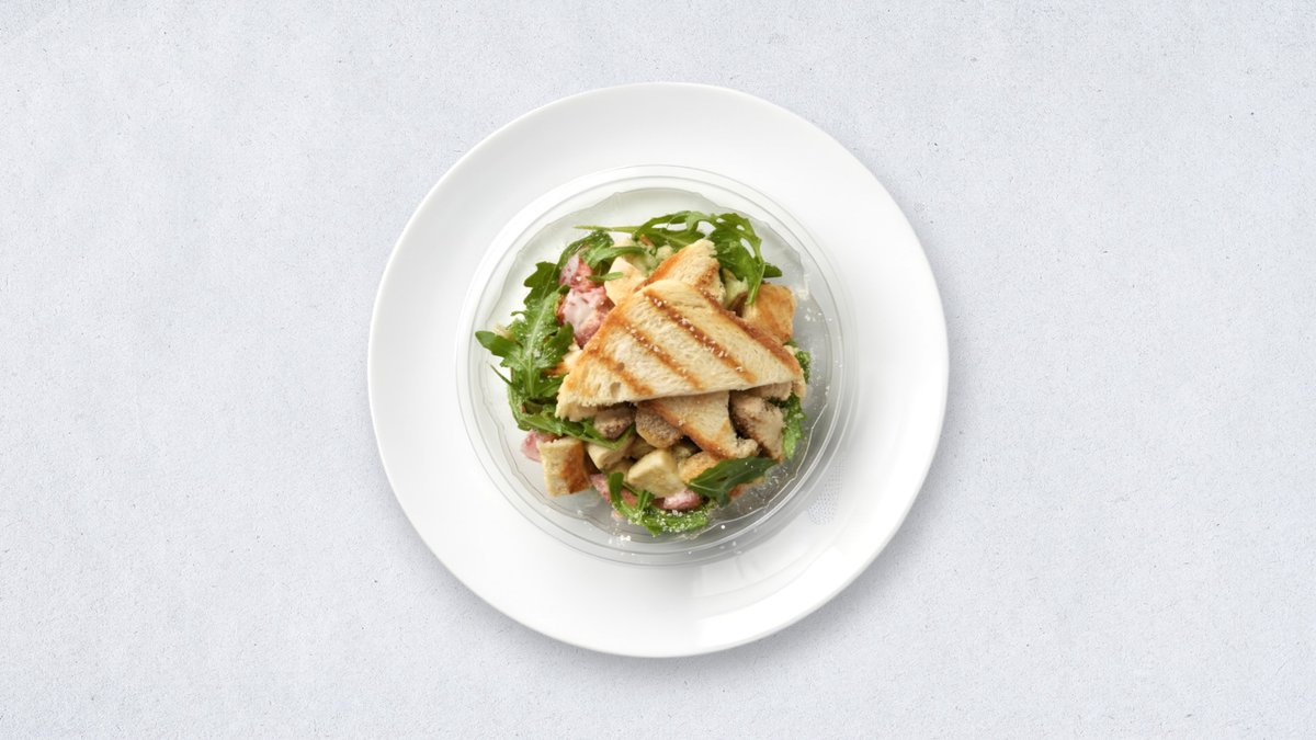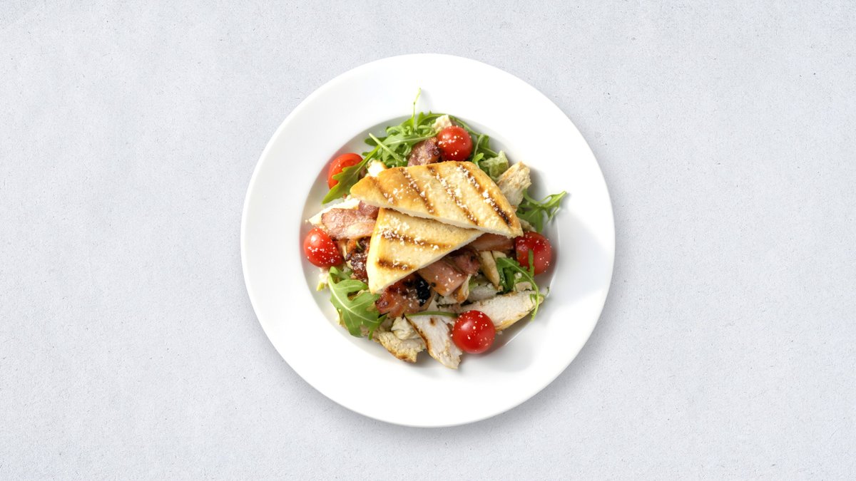 Paradajz, krastavac, zelena salata, pileći file, krutoni, dresing