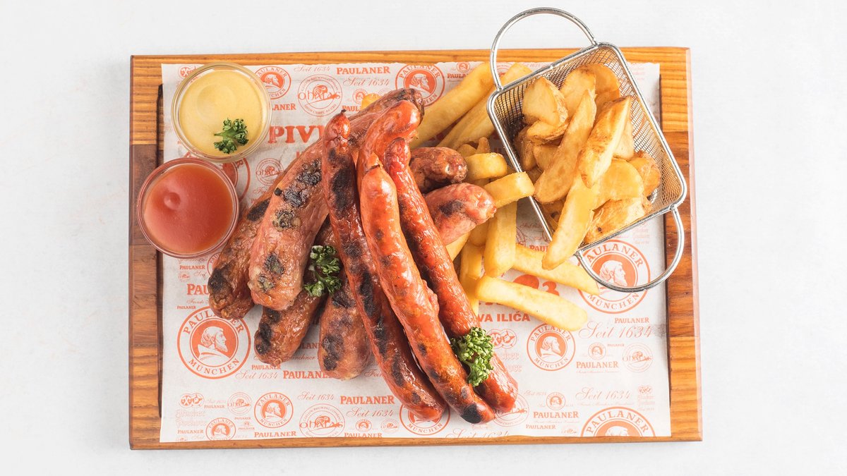 2x Kačkavalj kobasica, 1x Govedja kobasica, 1x Pivska kobasica, 2x Domaća tanka ljuta kobasica, frydip krompir i wedges krompir