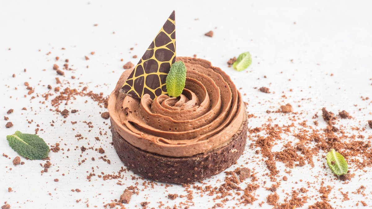 spoj čokoladne korice i kremova od maskarpone sira i pistaća, upotpunjen pireom od malina i dehidrisanim malinama