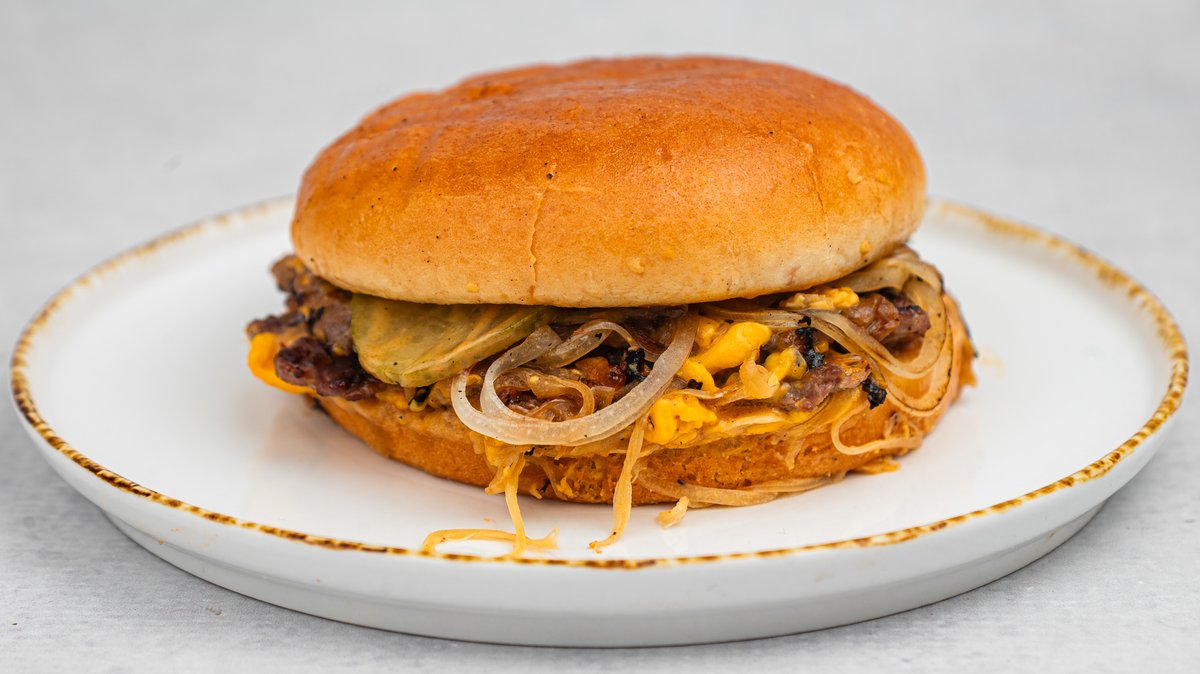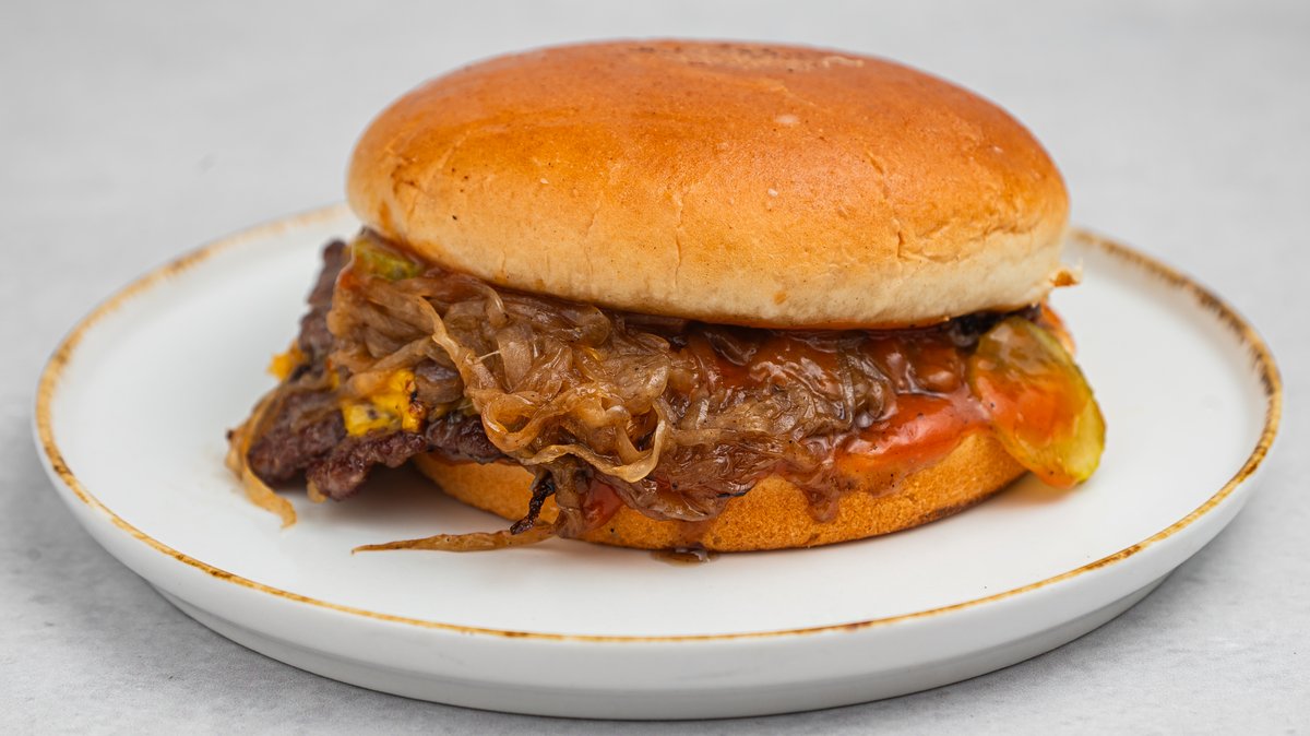 Brioš zemička 2x70 G junećeg mesa sa rendanim lukom, američki sir, kiseli krastavac i Oklahoma sos