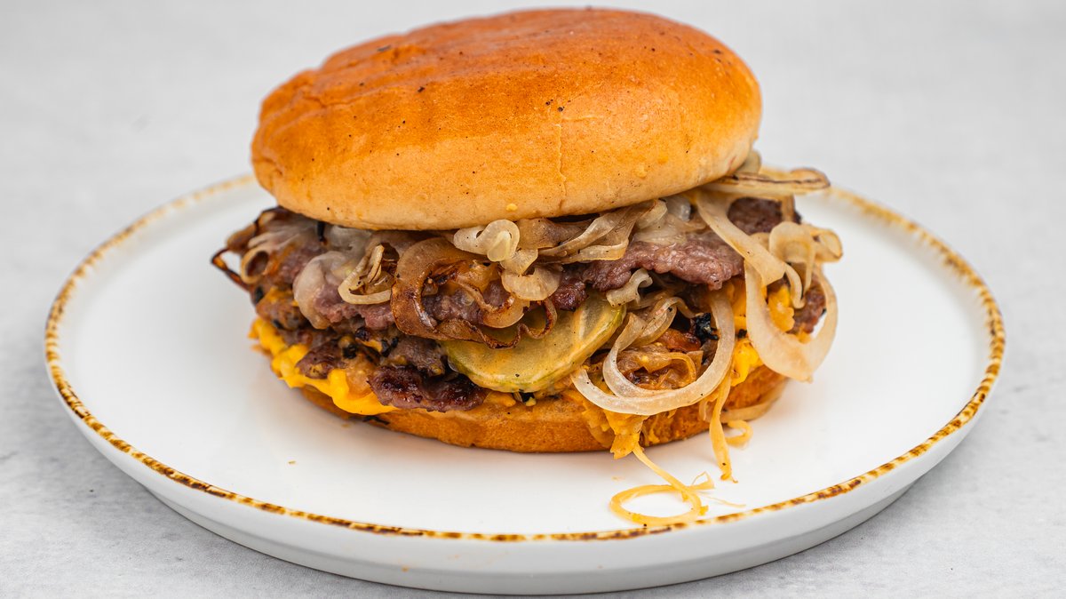 Brioš zemička 3x70 G junećeg mesa sa rendanim lukom, američki sir, kiseli krastavac i Oklahoma sos