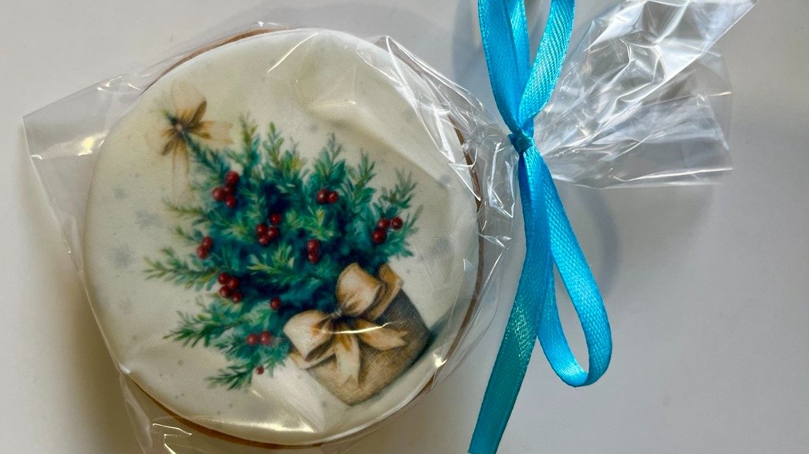 Okrugli medenjak sa novogodišnjim dekorom u pojedinačnom pakovanju