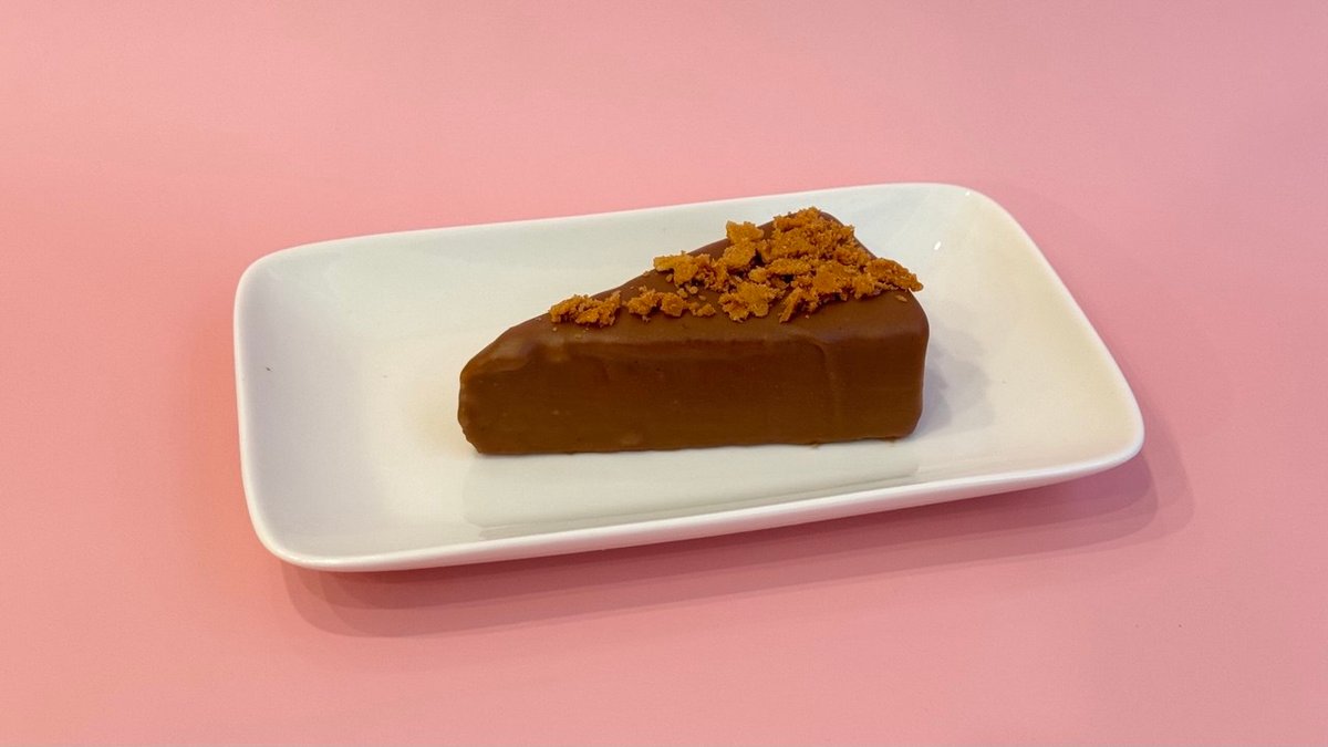 Klasični krambl sa karamelom, karamelno-sirna osnova, sloj domaće karamele, preliv – mlečna čokolada 130g