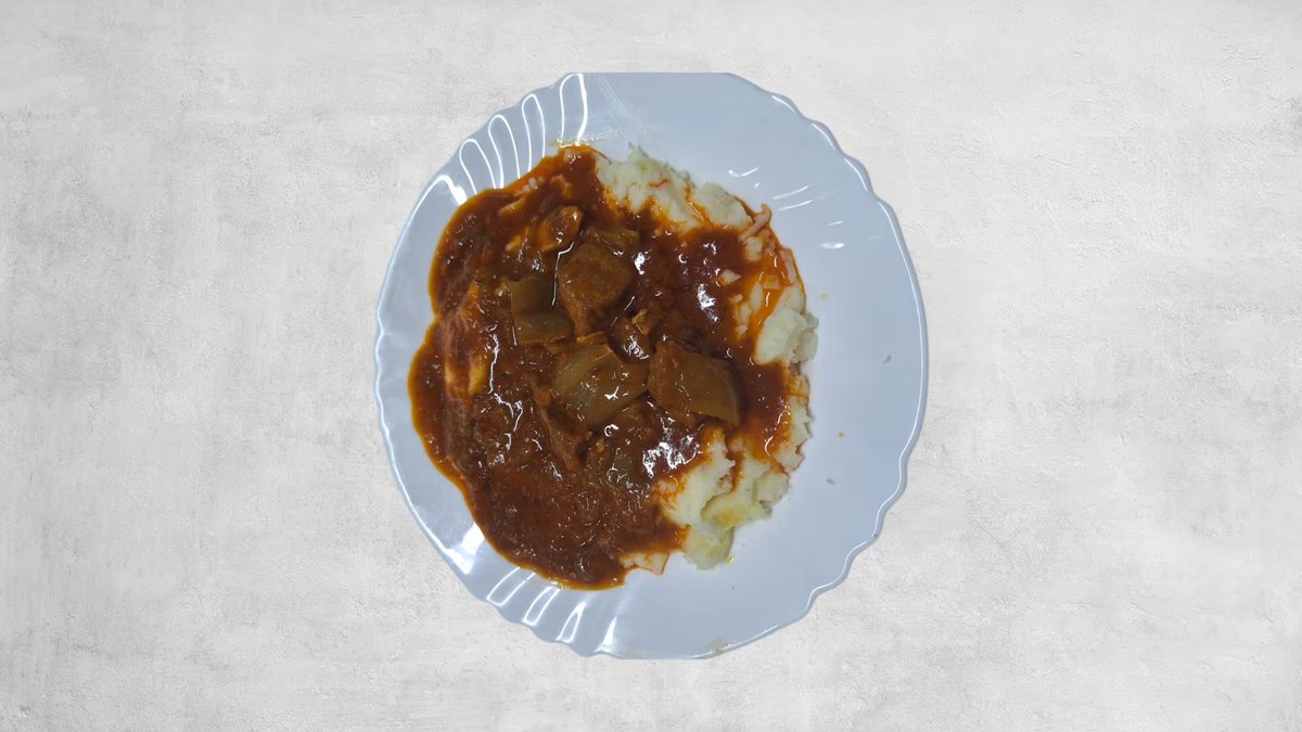luk,paprika,slaninica,svinjsko meso,lagano krčkano u paradajz pelatu+ pire