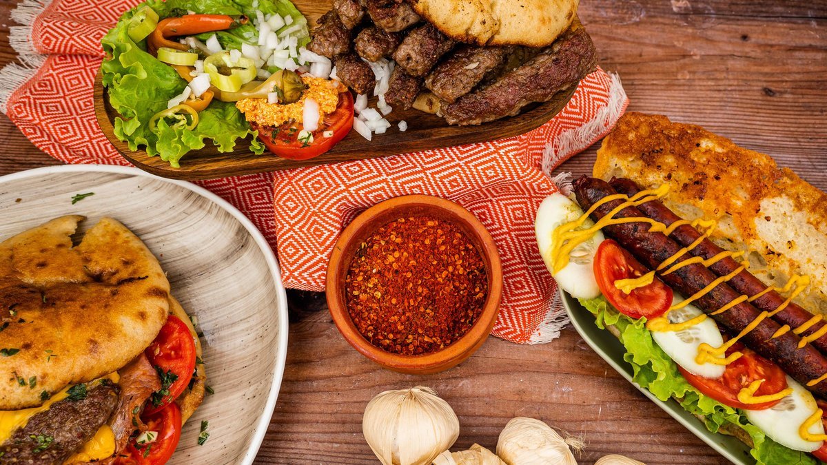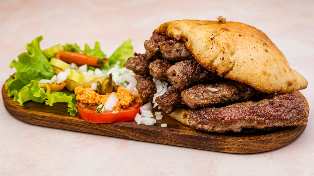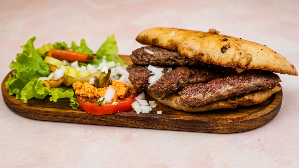Ćevapi, uštipci, kobasica,pileci file,pileci batak i prilog luk, kupus, urnebes,2 somuna