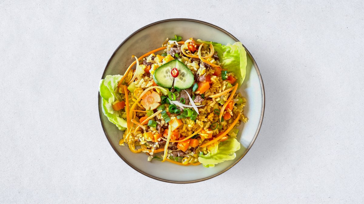 Combo 3 (Prženi pirinač sa mesom + 2 prolećne rolnice + piće)