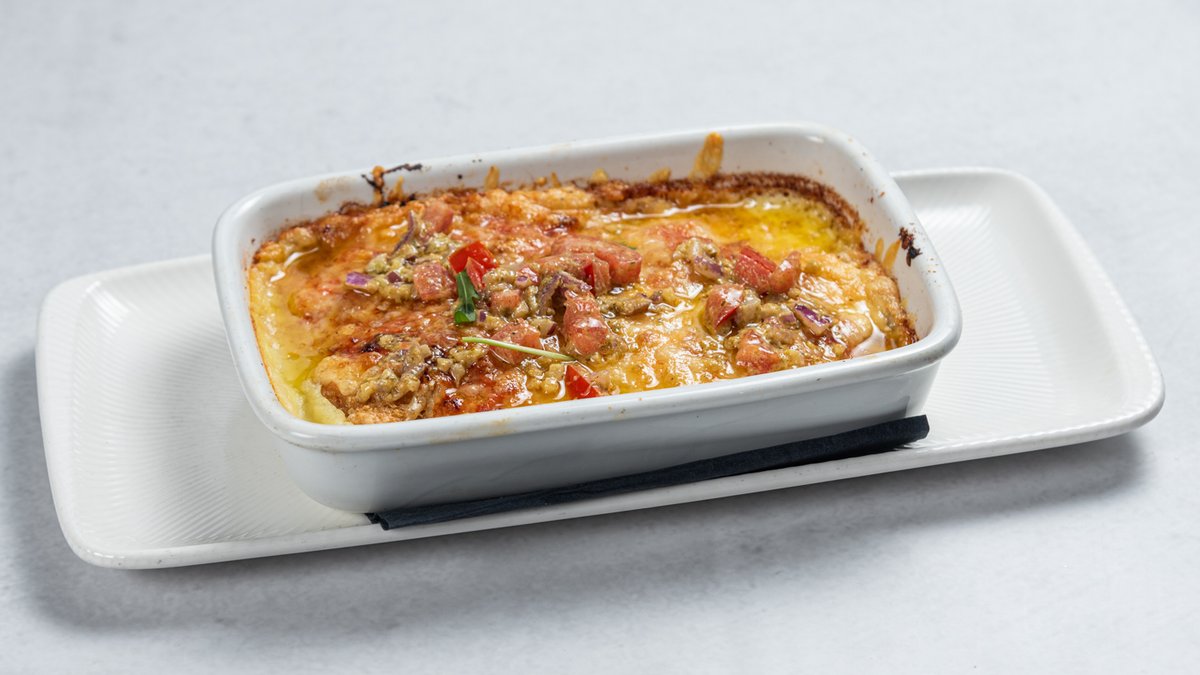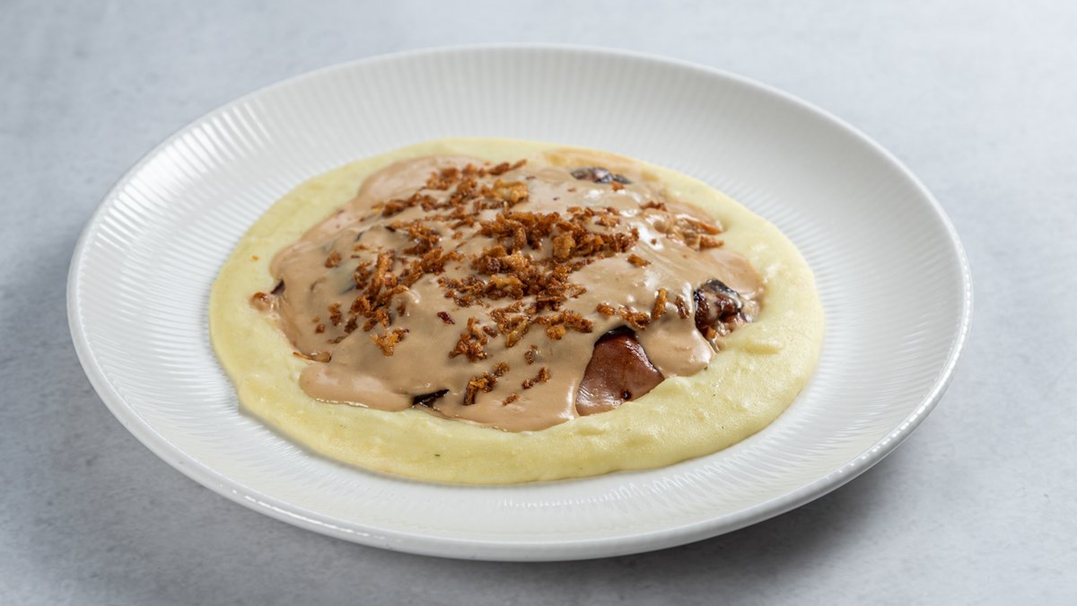 Juneće meso, kajmak, burek testo / hleb, pomfrit, luk