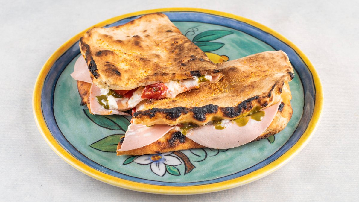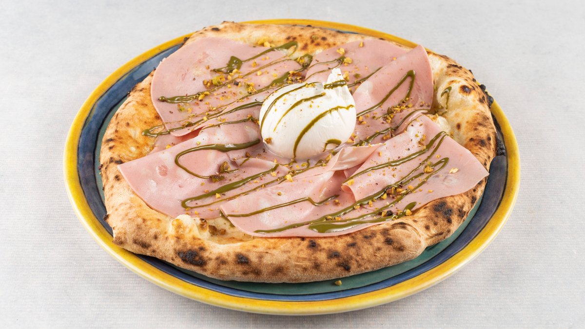 Mozzaerla, mortadela, burata, krema od pistaća, bosiljak, pistaći