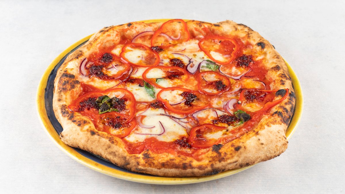 Pelat, nduja, mozzarela, crvena paprika, crveni luk, bosiljak