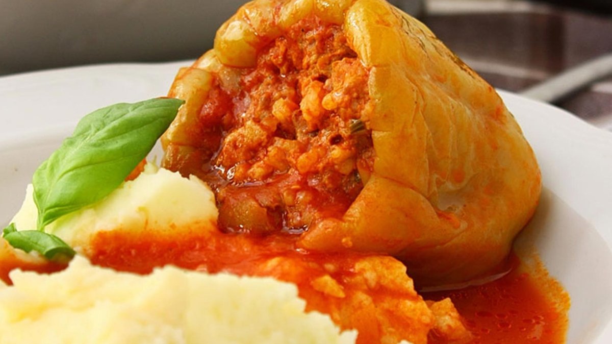 Paprike, pirinač, luk, svinjsko mleveno meso, pire krompir