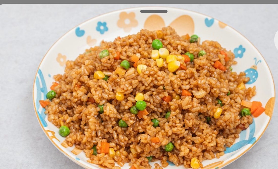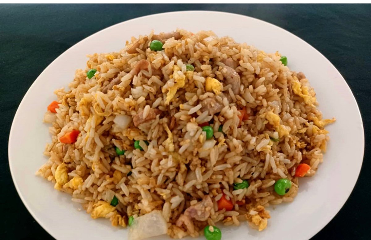 Pork,rice, eggs, green and red bell peppers, cabbage, green peas, and corn.