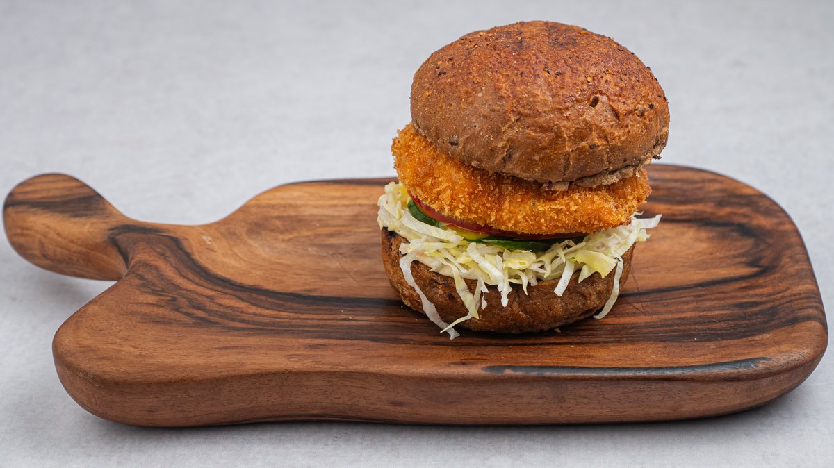 Punjeni pileći burger sa chedar sirom u hrskavoj korici, ražani ban, krastavac, ajzberg, paradajz, cezar dresing.