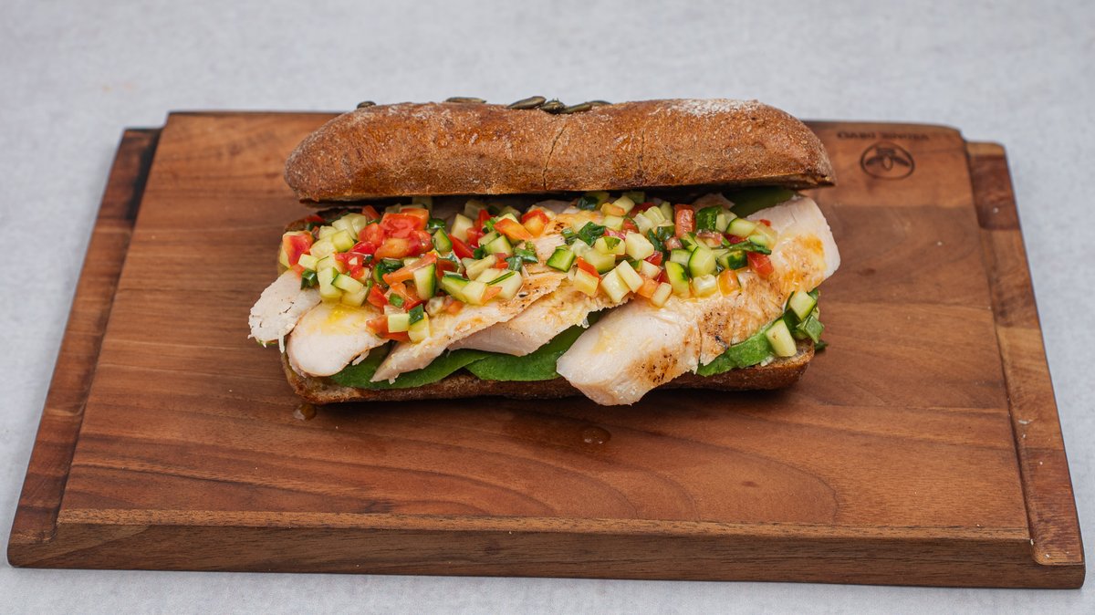 Integralna čabata, grilovani pileći file, avokado, širazo salsa, citrusni dresing.