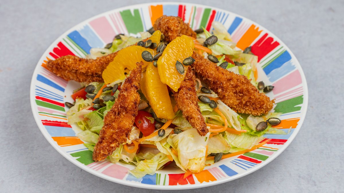 Hrskavi pileći štapići, ajzberg, semenke golice, čeri paradajz, citrusi, šargarepa, citrusni dresing.
