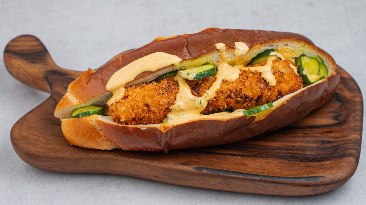 Pileći file punjen edamerom i sušenim paradajzom, u pohu, kifla, marinirani krastavac, senf dresing.