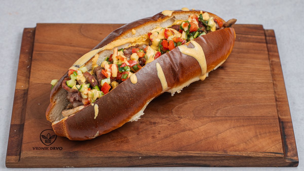 Juneća kobasica (suđukica), širazo salsa, hrskavi praziluk, burger dresing u kifli.