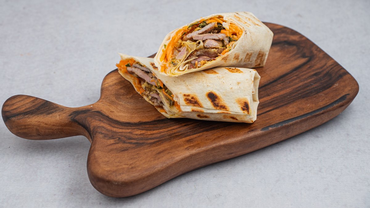 Lavaš sa mariniranim svinjskim vratom, korejskom šargarepom i kupusom sa senf dresingom.
