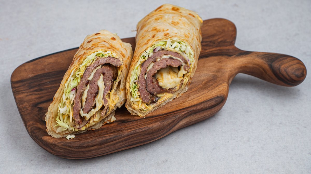 Smesh pljeskavica u burek testu, sa salatom od luka, edamerom i senf dresingom.