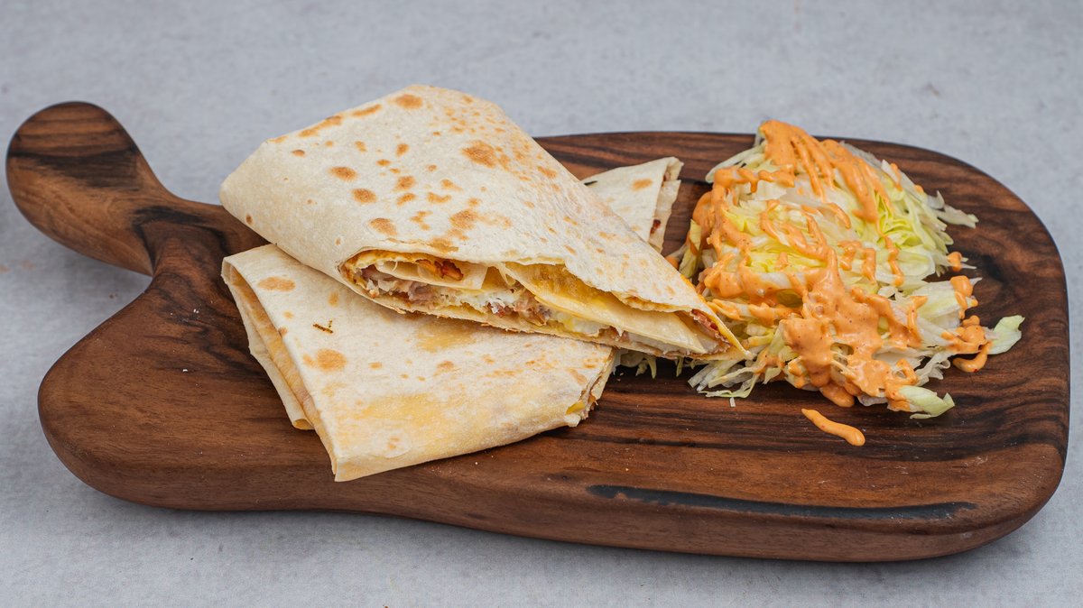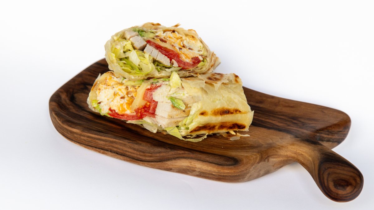 Lavaš sa pilećim batakom, marinirani krastavac, glazirani šampinjoni, paradajz i cezar dresing.