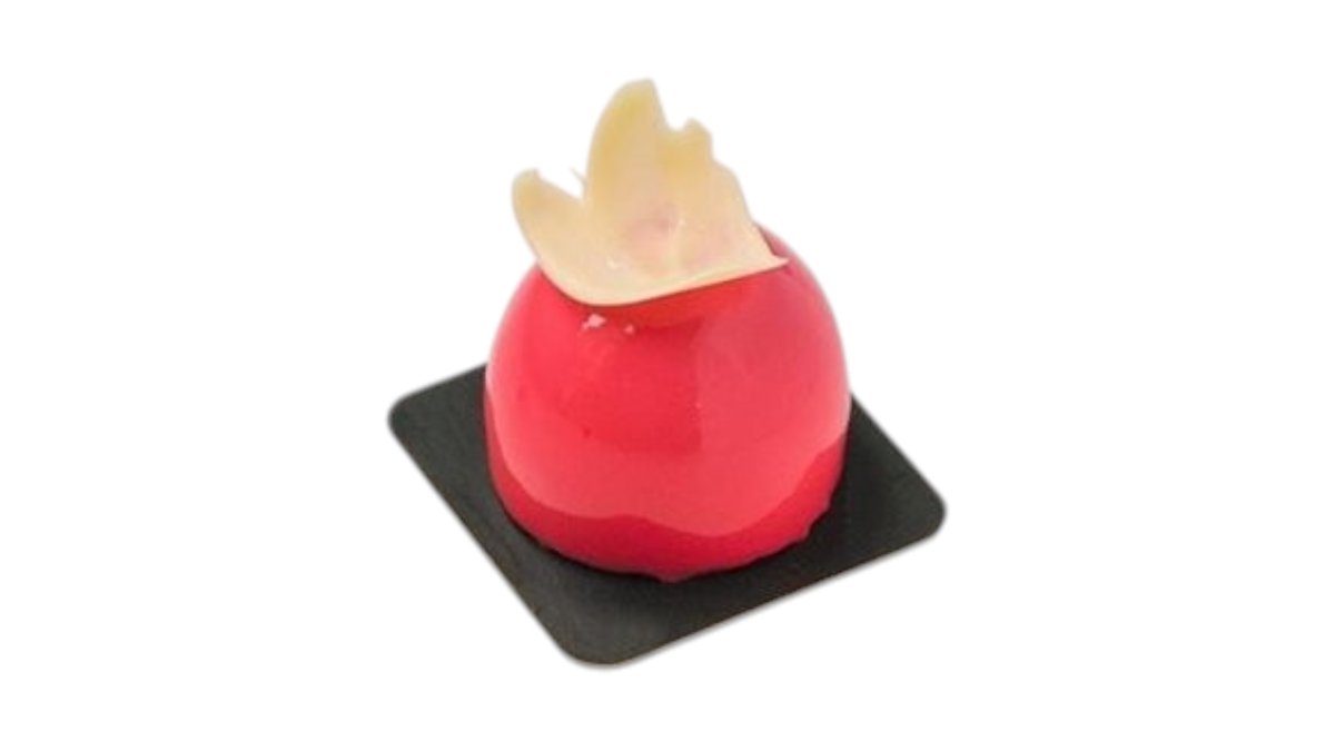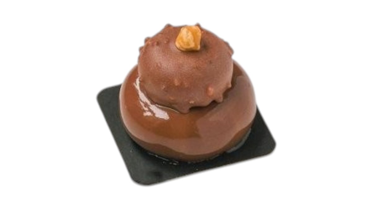 Osvežavajući mus od marakuje i manga na korici od crne čokolade, umočen u roche od mlečne čokolade i lešnika.