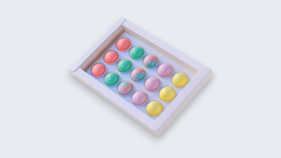Kockica i figurice od bele čokolade, Ruby čokolade, mlečne čokolade, crne čokolade i crne čokolade punjene đandujom i komadićima lešnika. alergeni: šećer, mleko u prahu, soja lecitin, kakao maslac, laktoza, lešnik