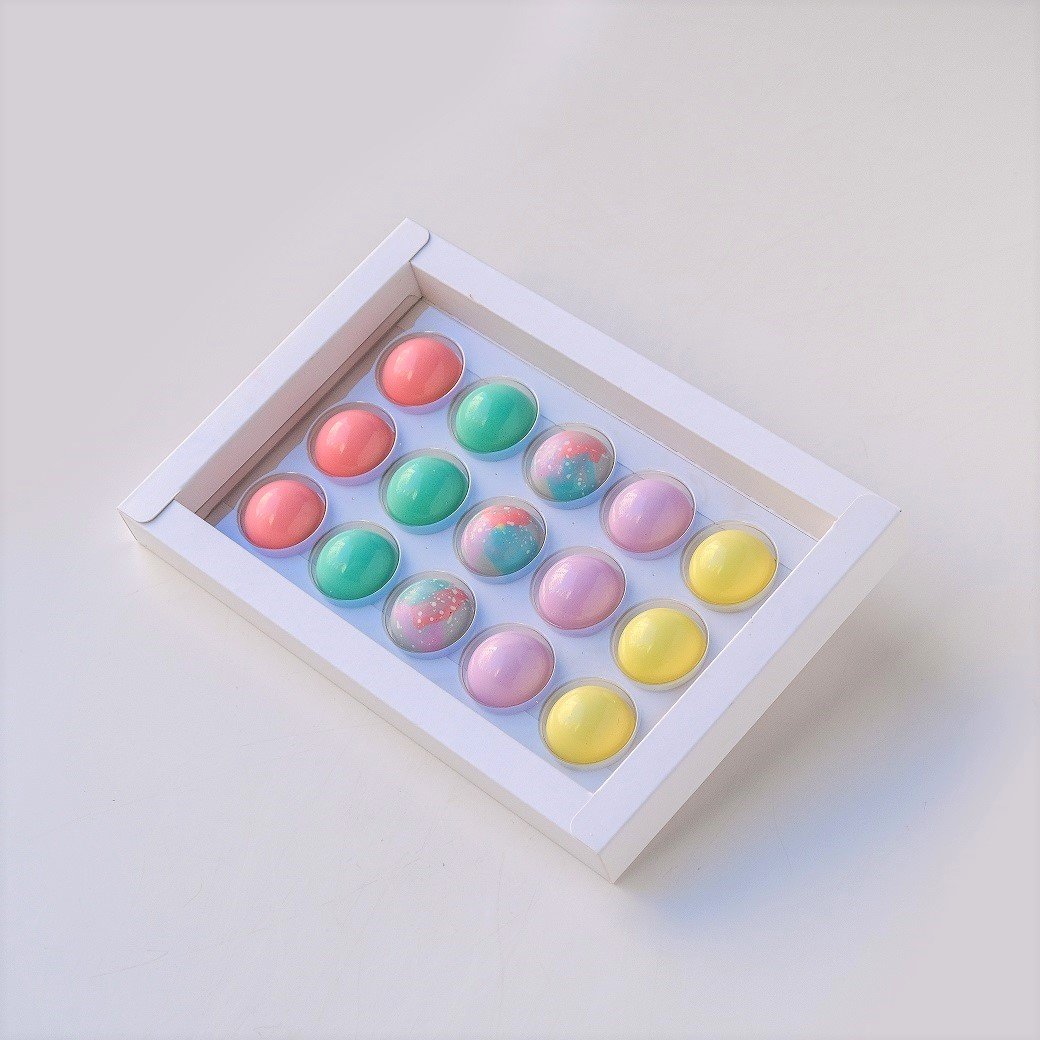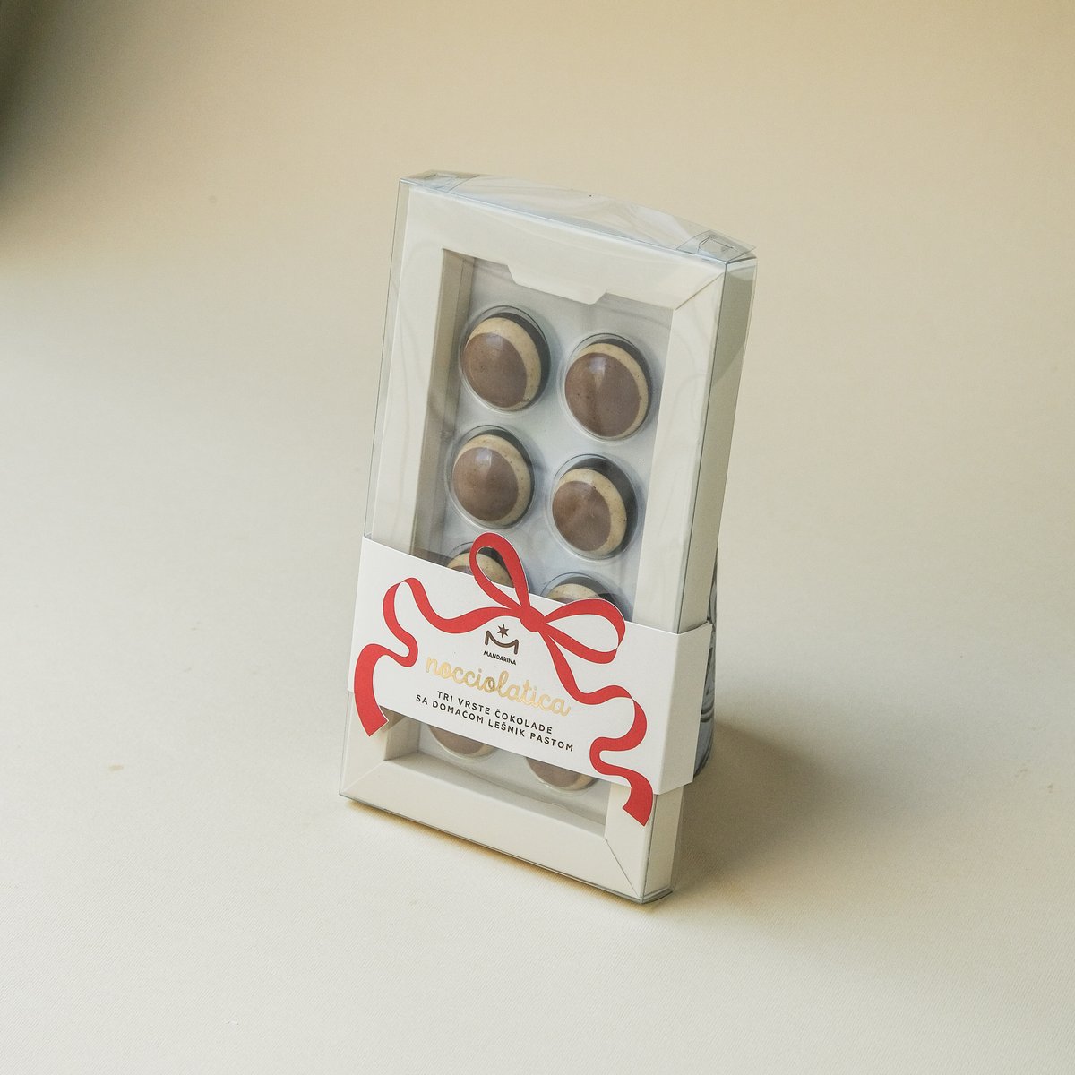 Kockica i figurice od bele čokolade, Ruby čokolade, mlečne čokolade, crne čokolade i crne čokolade punjene đandujom i komadićima lešnika. alergeni: šećer, mleko u prahu, soja lecitin, kakao maslac, laktoza, lešnik