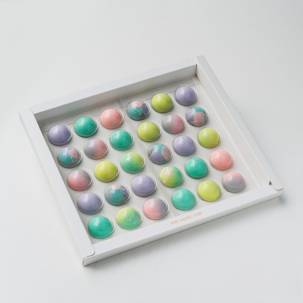 Bela čokolada sa usoljenim pistaćima i dehidriranim malinama; Mlečna čokolada sa lešnikom; Crna čokolada (54% kakaoa) sa bademom i đumbirom; Gold čokolada sa čokoladnim keksom i limetom; Ruby čokolada sa kokosom