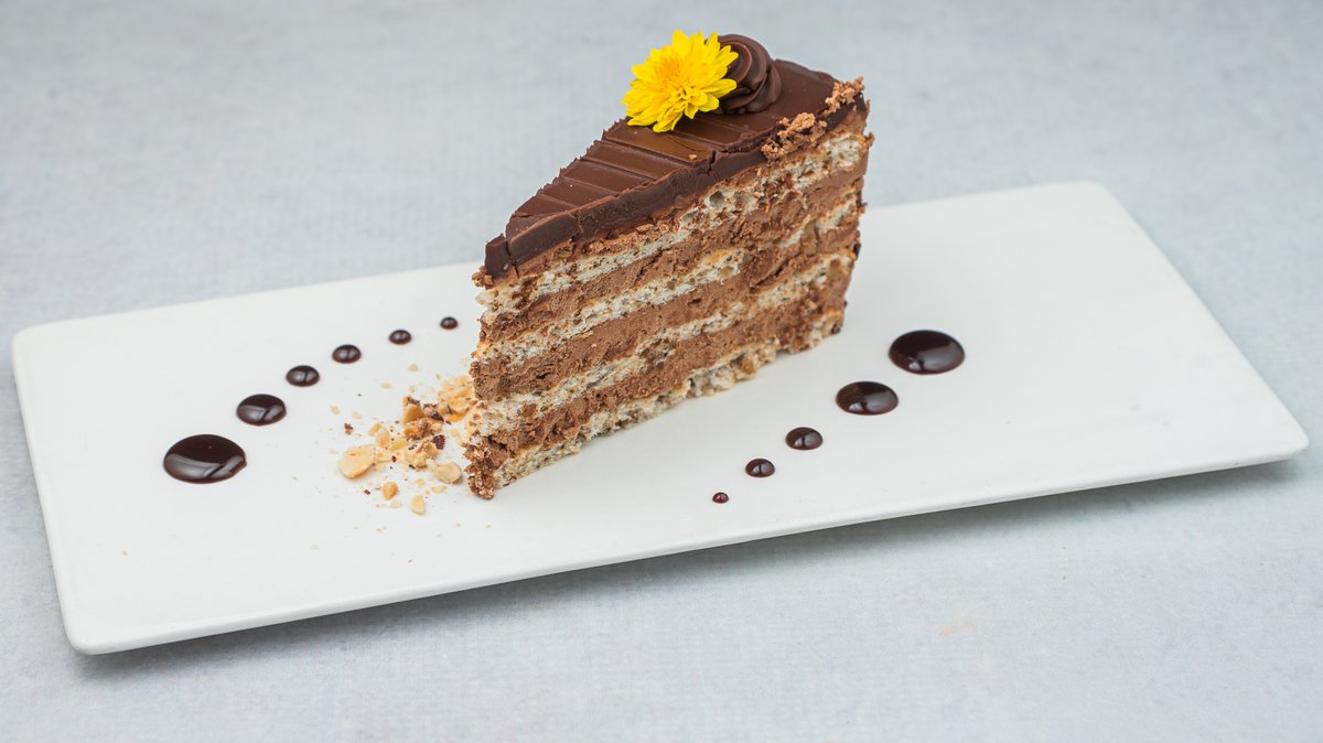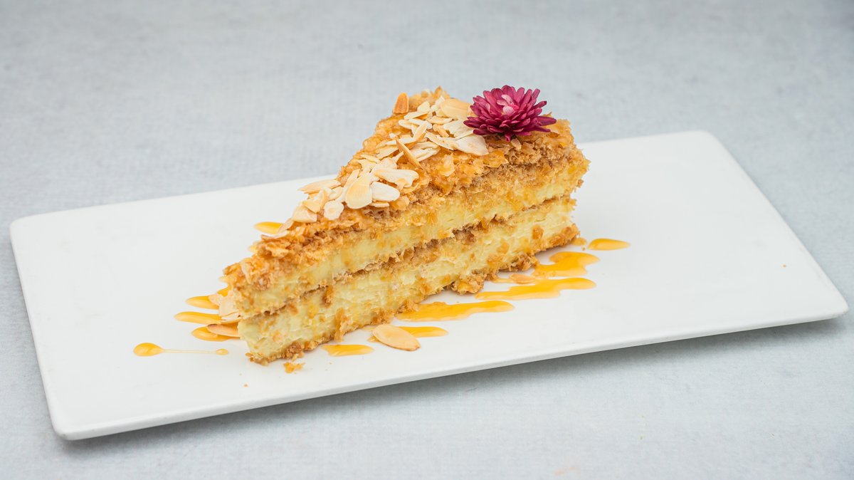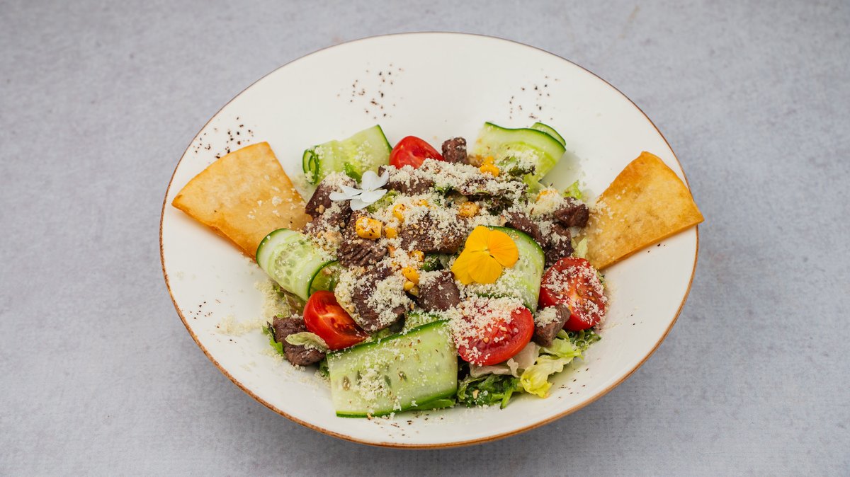 Juneći biftek, mix zelenih salata, rukola, čeri paradajz, karamelizovani lešnik, marinirani krastavac, dresing, kukuruz šećerac, čips od testa