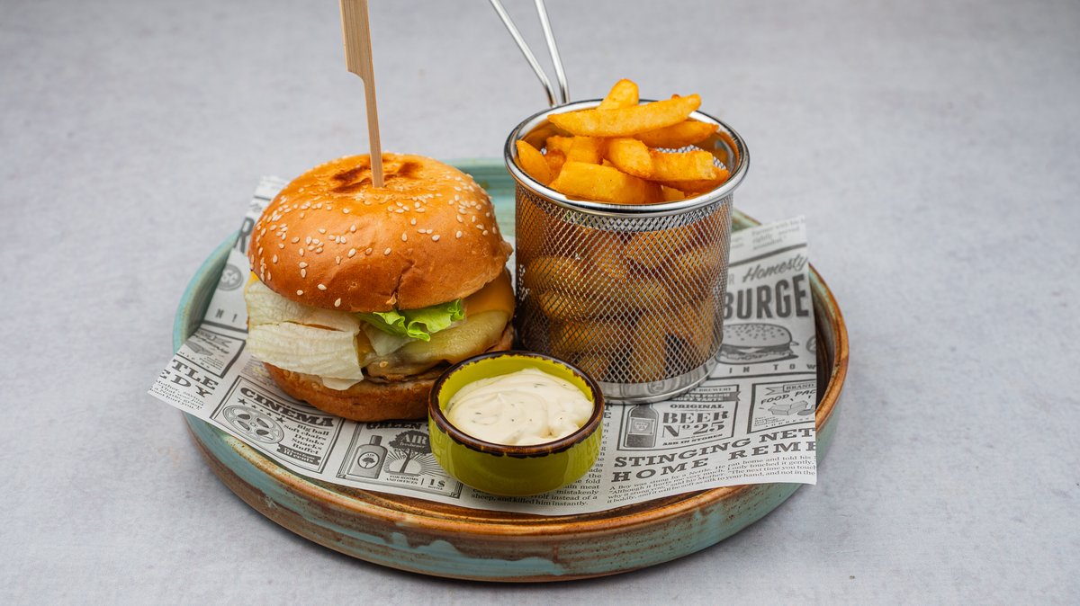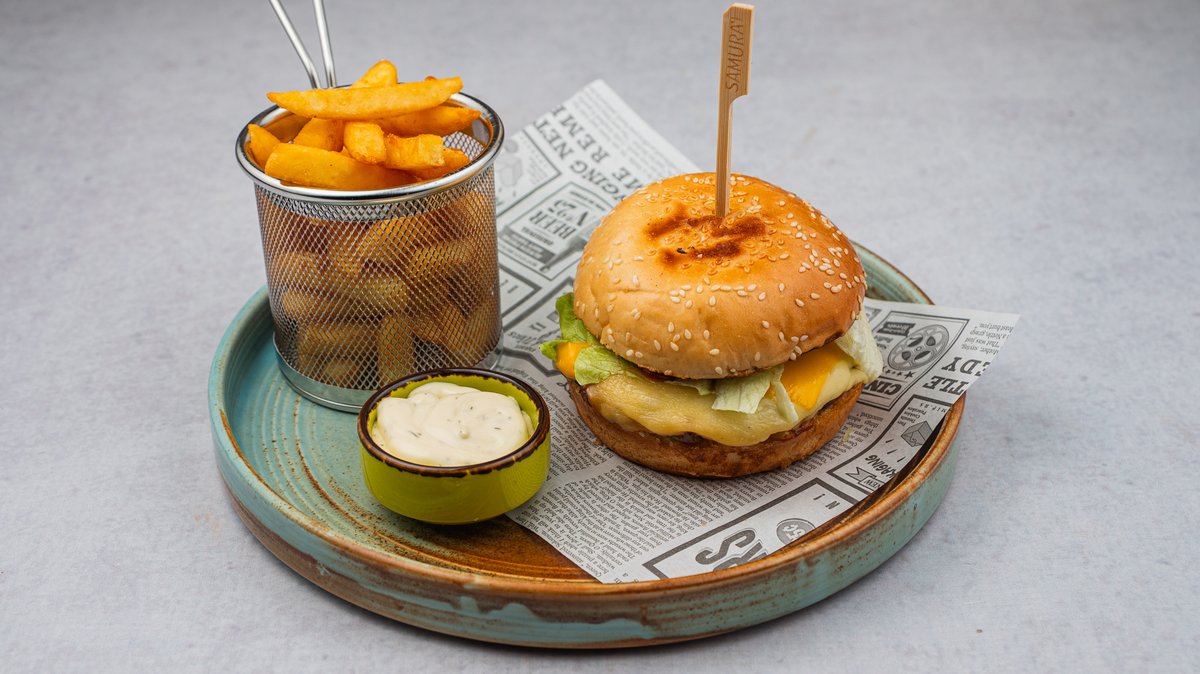 Burger zemička, juneći burger, čedar sir, pančeta, tajni sos, karamelizovani luk, iceberg, pomfrit, kečap
