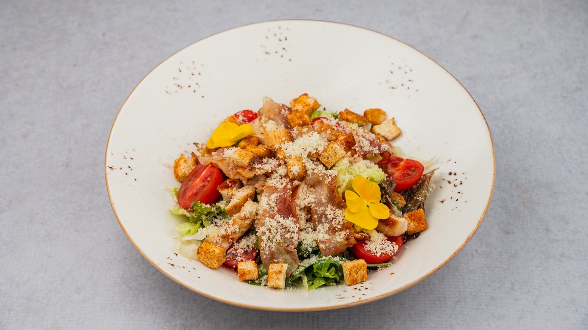Pileći file, pančeta, parmezan, krutoni, iceberg salata, rukola, čeri paradajz, cezar dresing