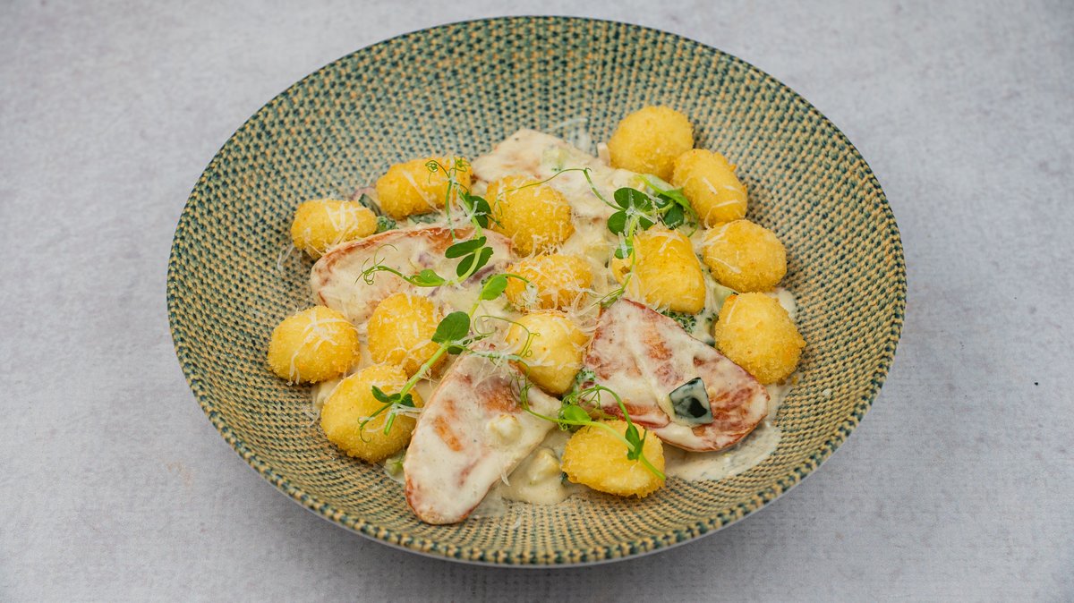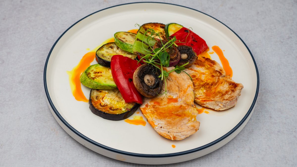 Ćureći file, brokoli, tikvica, crveni luk, gorgonzola sos, fritirane njoke od krompira