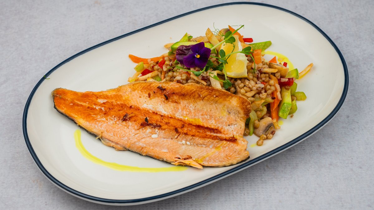 Fileti losos pastrmke, šargarepa, celer, paprika, tikvica, patlidžan, pšenica