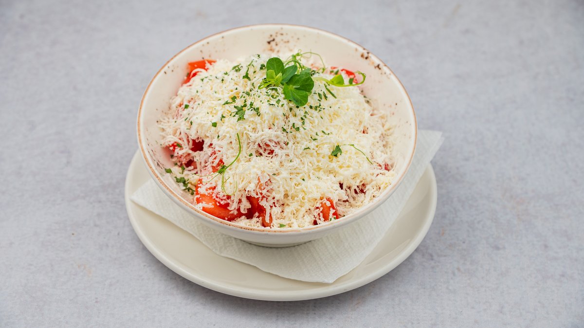 3 jaja, gauda, mix zelenih salata sa rukolom, paradajz + hleb