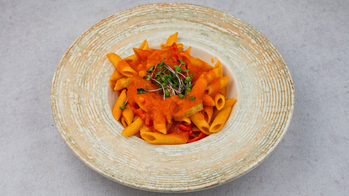 Testenina, paradajz sos, tikvica, paprika, patlidzan, celer štap, čeri paradajz