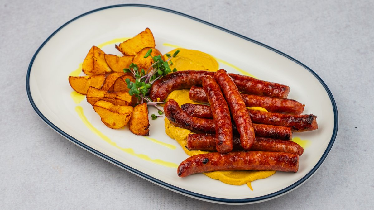Dimljena pikantna roštiljska kobasica, krompirići, senf