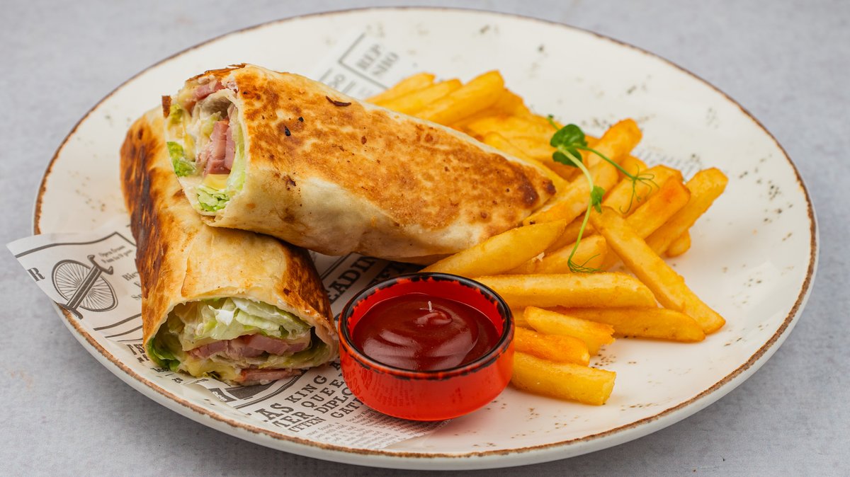 Domaća tortilja, dimljeni pileći batak, gauda, sirni namaz, iceberg, dresing, pomfrit, kečap